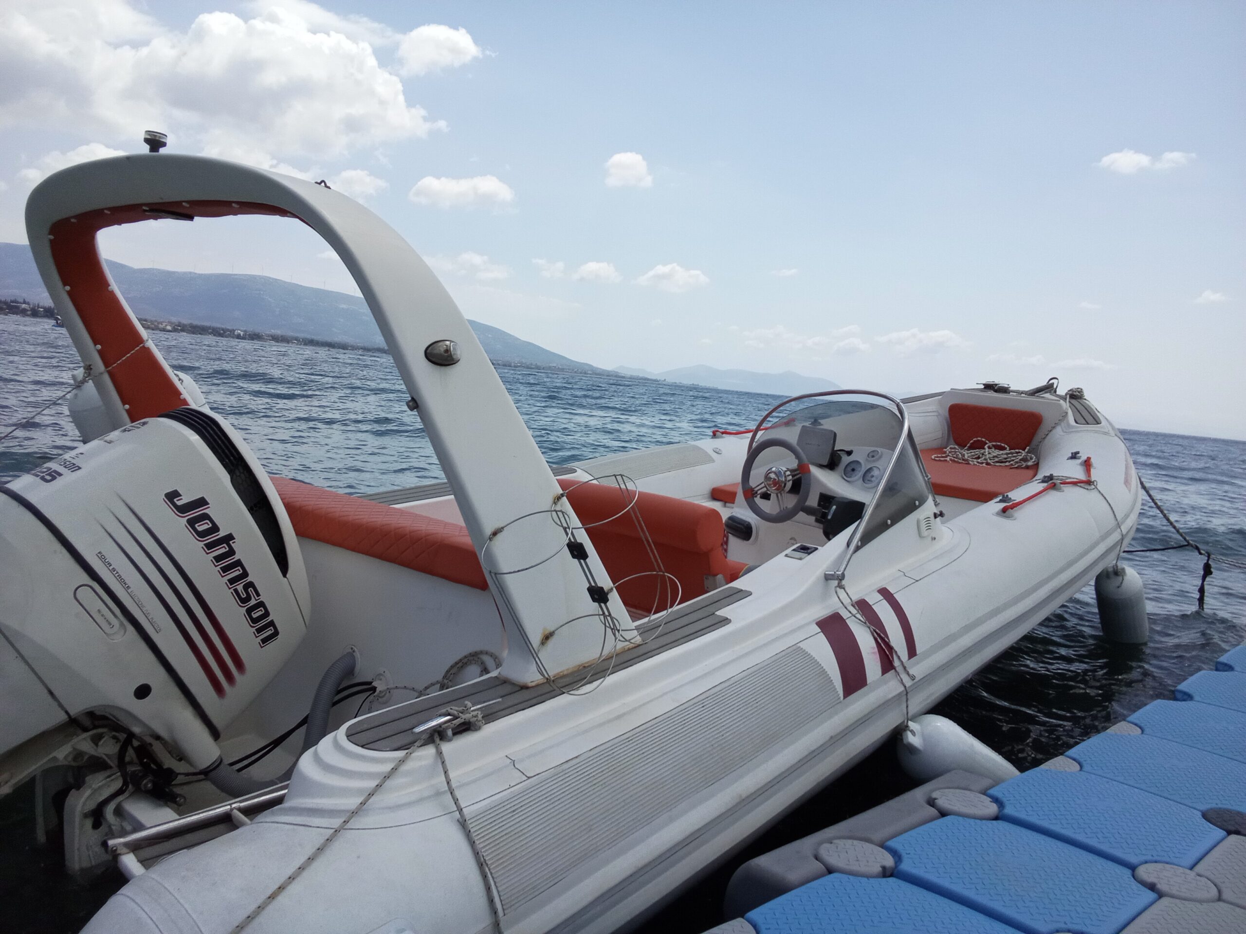 Φουσκωτό ταχύπλοο εξοπλισμένο με άνετα καθίσματα, μουσική τέντα πλεύσης, αποθεκευτικούς χώρους, σκάλα επιβίβασης – αποβίβασης.